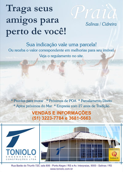 Rua Barão do Triunfo, 720 cj 806 - Porto Alegre - RS - Fone: (51) 3223.7784 Av. Interpraias 9000 - Salinas / Cidreira - RS - Fone: (51) 3681.5663